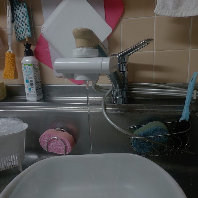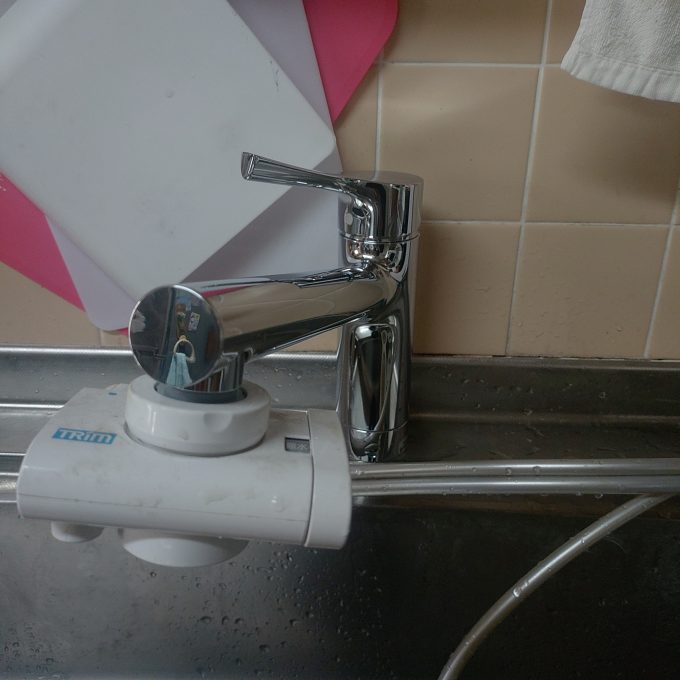 後付けの浄水器側に蛇口が傾いており、蛇口の根元から下にある止水栓に伝い漏れしています。