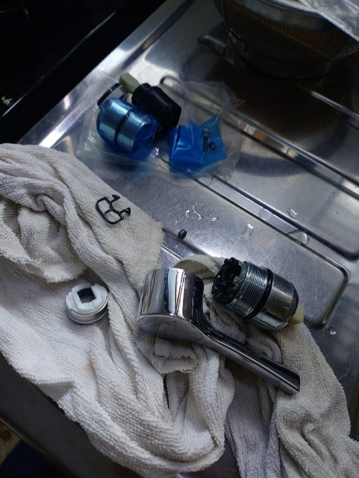 その後はレバー部分を分解し、古いバルブカートリッジを新しいものに交換。